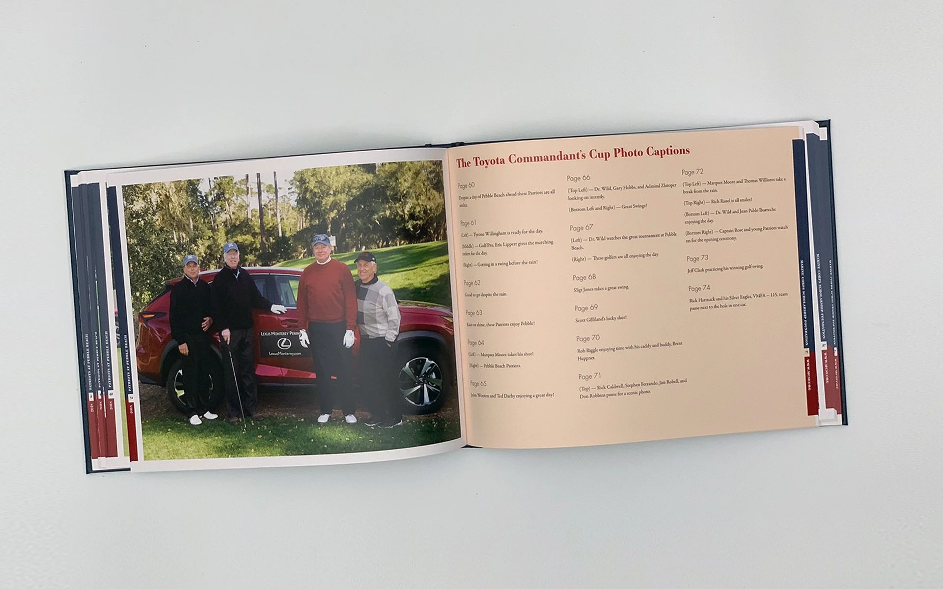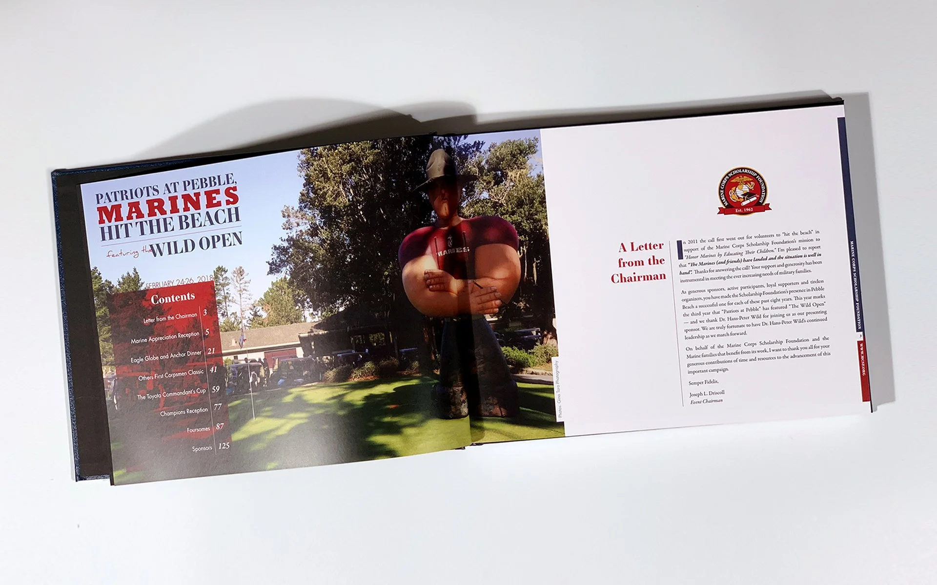 This 100-page hardcover photobook was produced for the Marine Corps Scholarship Foundation as a heartfelt token of appreciation for their distinguished donors who participated in the annual “Patriots at Pebble Beach: The Wild Open” golf tournament, generously sponsored by Dr. Hans-Peter Wild. This exclusive keepsake commemorates a weekend dedicated to honoring the Marine Corps and their families, celebrating the profound impact of individuals and corporations committed to supporting their military community.